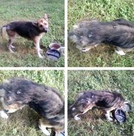 Soda Pop had barely any fur left on his body when he went into rescue. He still has a few skin issues flare up at time but it's managed with medication.