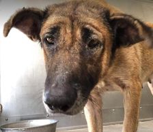 Trevor was either picked up as a stray or he was confiscated/abandoned. The details are unclear at this time. He was sent to the San Bernadino Shelter. He is estimated to be around 10 years old. He's very thin, infested with fleas and ticks and his teeth are very worn down. The volunteers bathed him twice and the water was the colour of tomato juice from all the flea blood.
